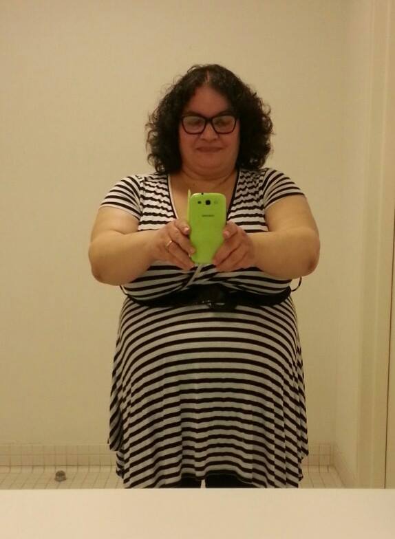 Sadly, a lot of fat women believe that message. Many years ago I believed it too and dressed in dark, solid colors and over-sized tops in hopes of making the world think that I didn’t possess a big stomach, butt or boobs. Then, on the journey to accepting and loving my body, I discovered how fabulous it looked in bold patterns, horizontal or chevron stripes of various sizes, bright colors and stretchy knits that hugged my stomach, boobs and butt instead of hiding them.